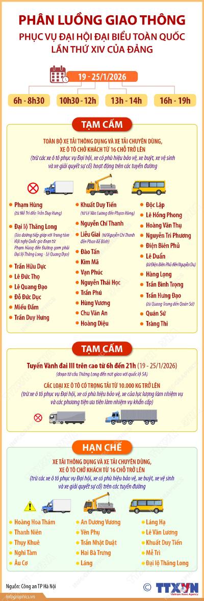 Kinh tế - Hội nhập Thông tin chi tiết về phân luồng giao thông trong những ngày diễn ra Đại hội Đảng XIV từ 19 đến 25/1/2026 16/01/2026 05:30